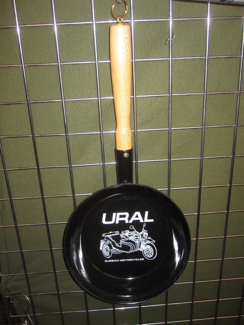 Uralpfanne aus Stahl emailliert, mit Ural Gespann auf der Bratfläche.